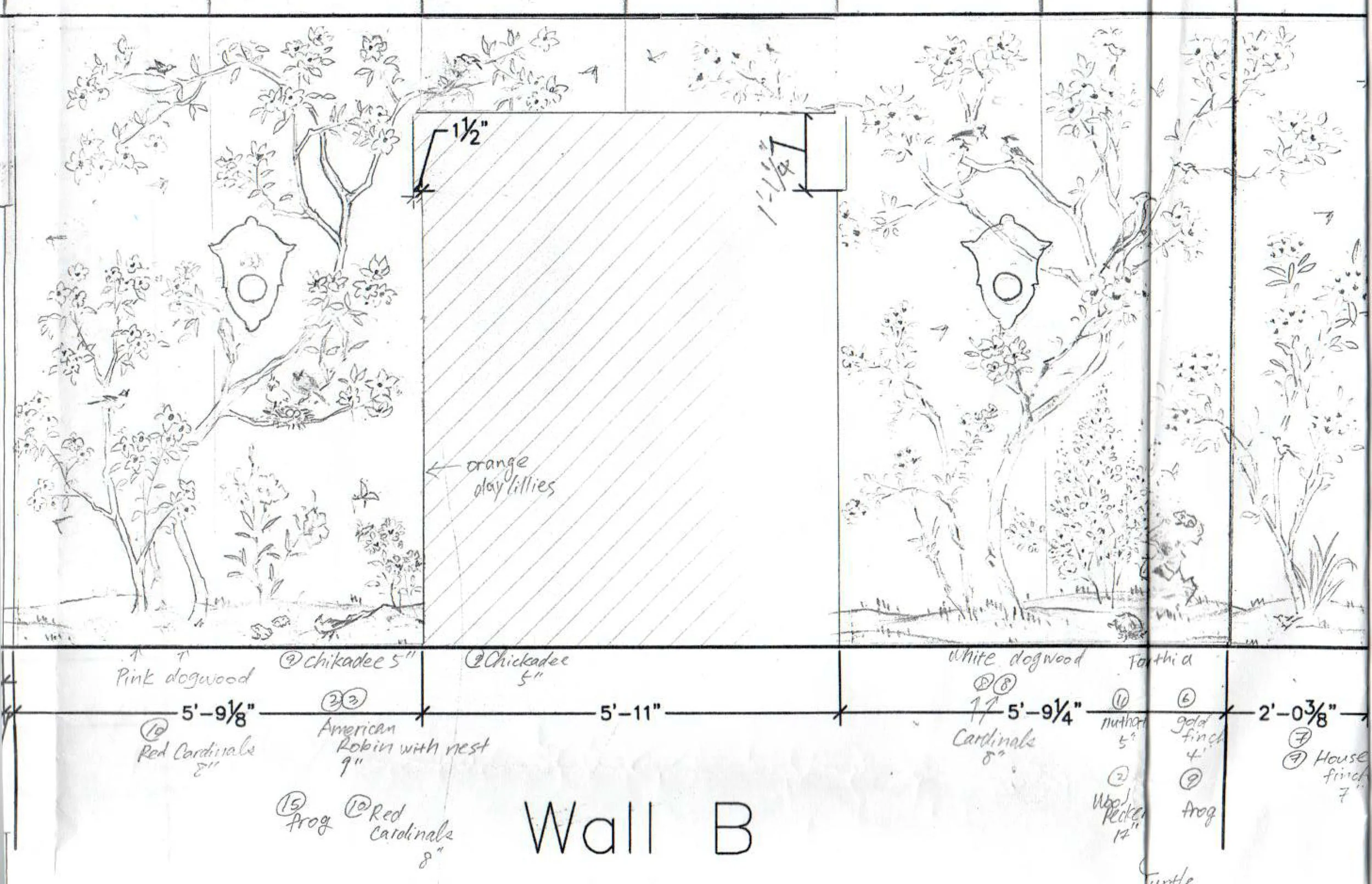 I spent months going back and forth with the homeowner and Gracie Studios to create panels which accurately reflected the birds listed above which are native to the area. But it’s not simply enough to list the bird species you would want on your panels. This particular wallpaper was hand painted in China where they are not necessarily familiar with the birds of America and their behaviors. It was up to us to provide them with the notes so we didn’t end up with hand painted hummingbirds the size of owls! It was also important to learn the behaviors of certain species. Did you know male cardinals are extremely territorial? We would not want to picture two bright red cardinals together in the panel when they would never be seen together in their natural habitat.