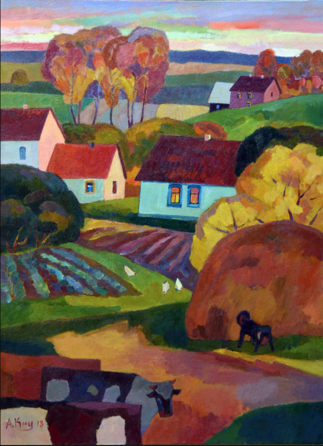 Andrei Kioresku, Russian landscape artist born and currently living in St. Petersburg, Russia, is inspired by classical works. Kioresku’s education from St. Petersburg Academy of Arts bleeds through his canvases. Educated by open-minded artists, and constantly surrounded by some of the greatest classical works, Kioresku’s pieces fall into subjective realism or post-impressionism styles. Although strictly surrounded by Russia’s lower, grey light and political ideals that can be restrictive of the creative mind, Kioresku breaks through in his art. His individualist approach to landscape paintings, inspired by his education, is not limited by the borders of where he lives. Similar to Nikolai Timkov’s inclusion of warmer light, Kioresku uses his imagination to blend humankind and nature. He uses bright, intricate colors on the seams of burlap canvases to pull reality and texture into his work. He continuously finds ways to explore the world’s landscapes without physically leaving Russia.
